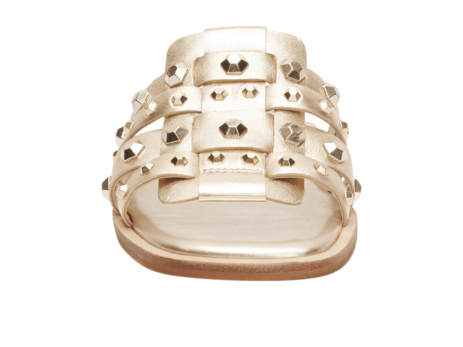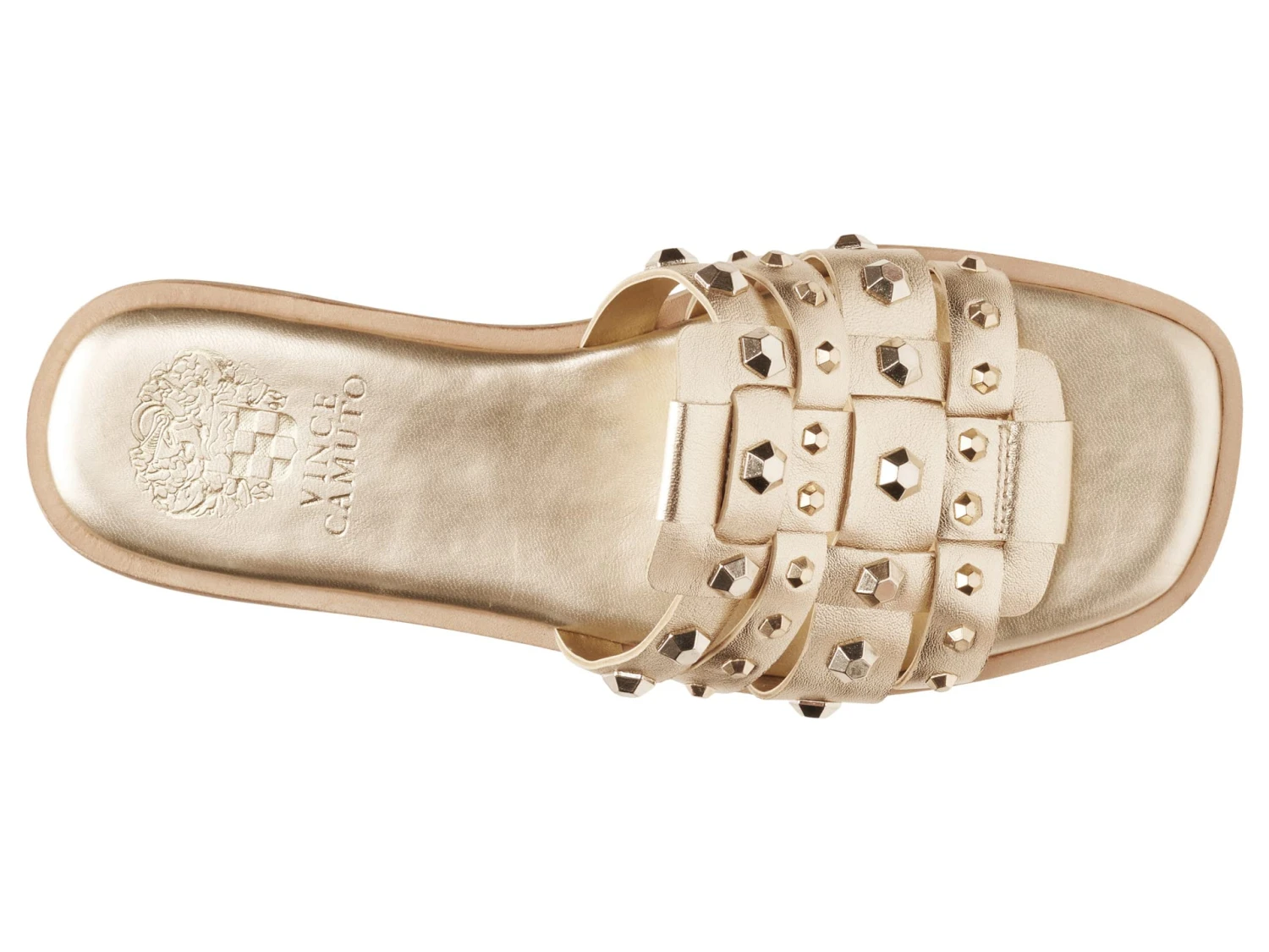 - Flat sandals crafted from leather upper with geometric-stud-embellished straps.