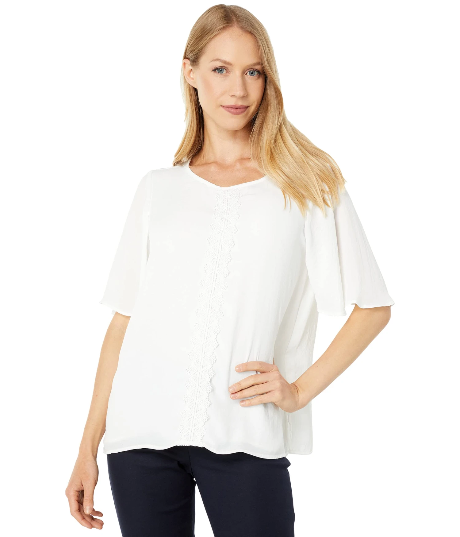 - Feel your best and love your look any day of the week wearing the Vince Camuto® Short Sleeve Center Front Diamond Dot Lace Tee.