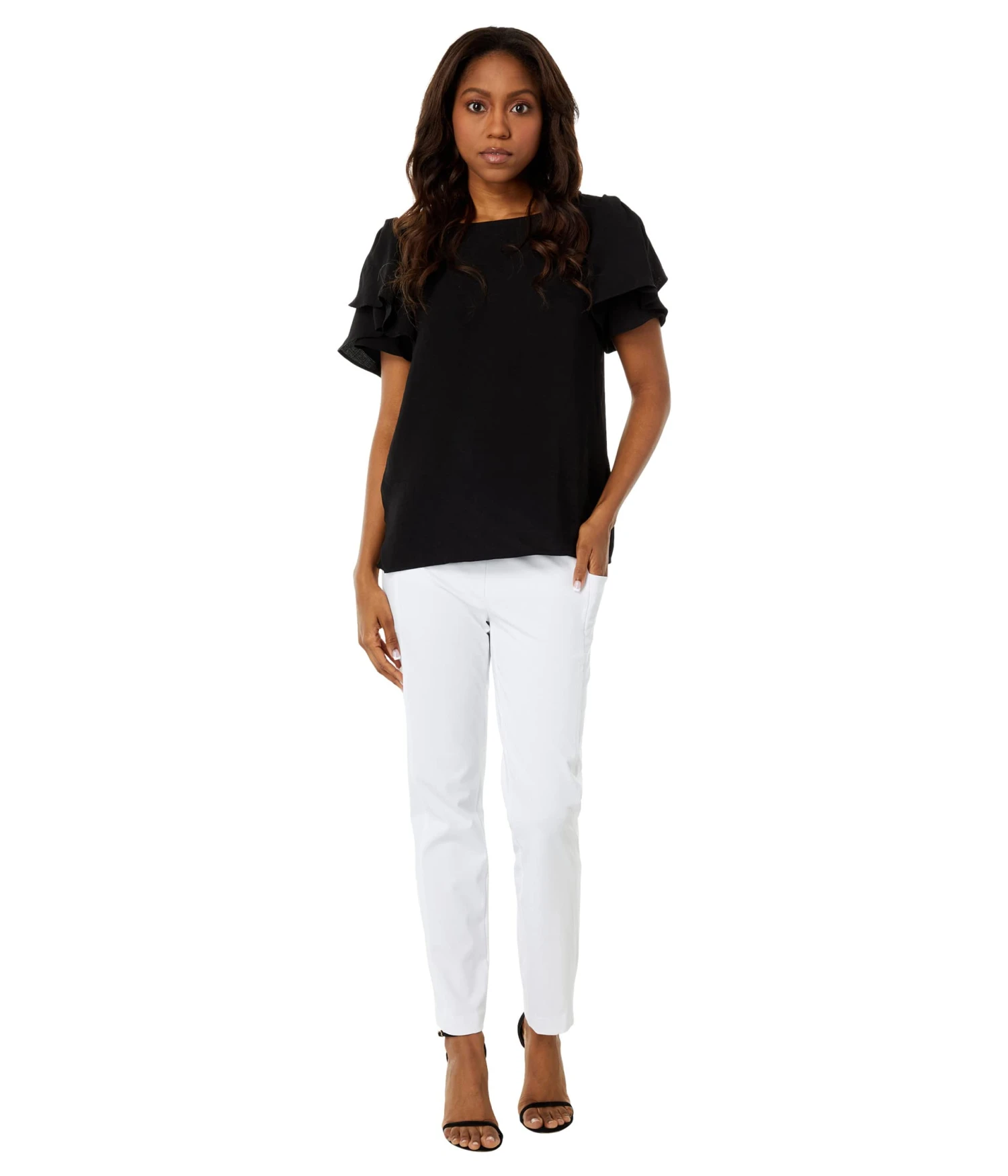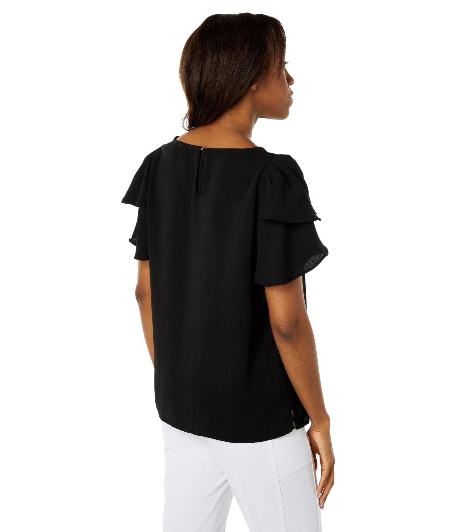 - Round neck and ruffled, double-layered short sleeves.